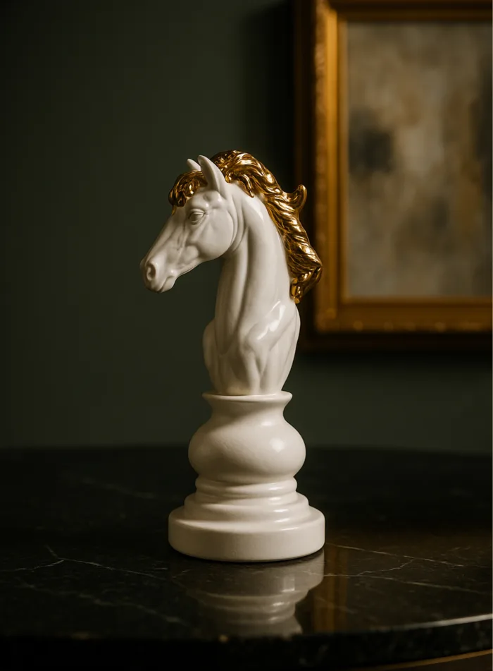 Elegant white-and-gold chess piece decorative sculptures (King, Queen, Knight). A refined accent for consoles, shelves, or home offices—display solo or as a set for a bold, timeless statement.
