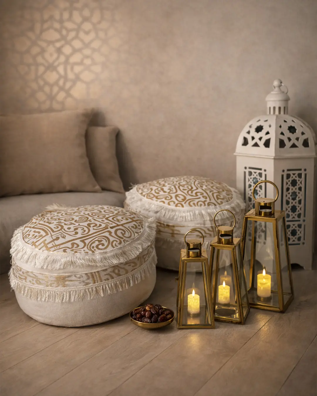 Crafted with a polished gold frame and minimalist structure, these lanterns are perfect for majlis styling, entrance decor, dining table centerpieces, or layered floor arrangements during Ramadan gatherings.