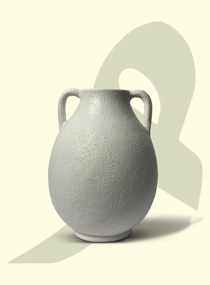 A timeless amphora-inspired ceramic vase in a matte stone-white finish with a textured surface. Its double-handle silhouette blends traditional charm with modern minimalism, making it a versatile accent for living rooms, dining spaces, or entryway styling.