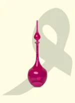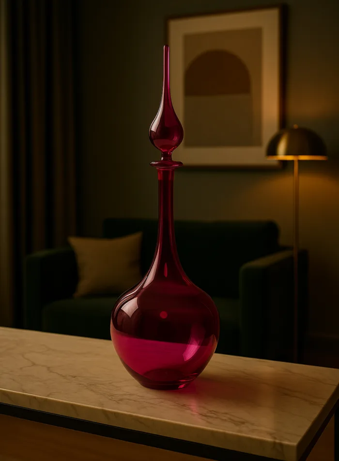 A striking tall decorative glass bottle in vibrant fuchsia with a slim neck and artistic stopper. Its bold color and elegant silhouette make it a perfect statement accent for consoles, dining tables, or modern shelf displays.