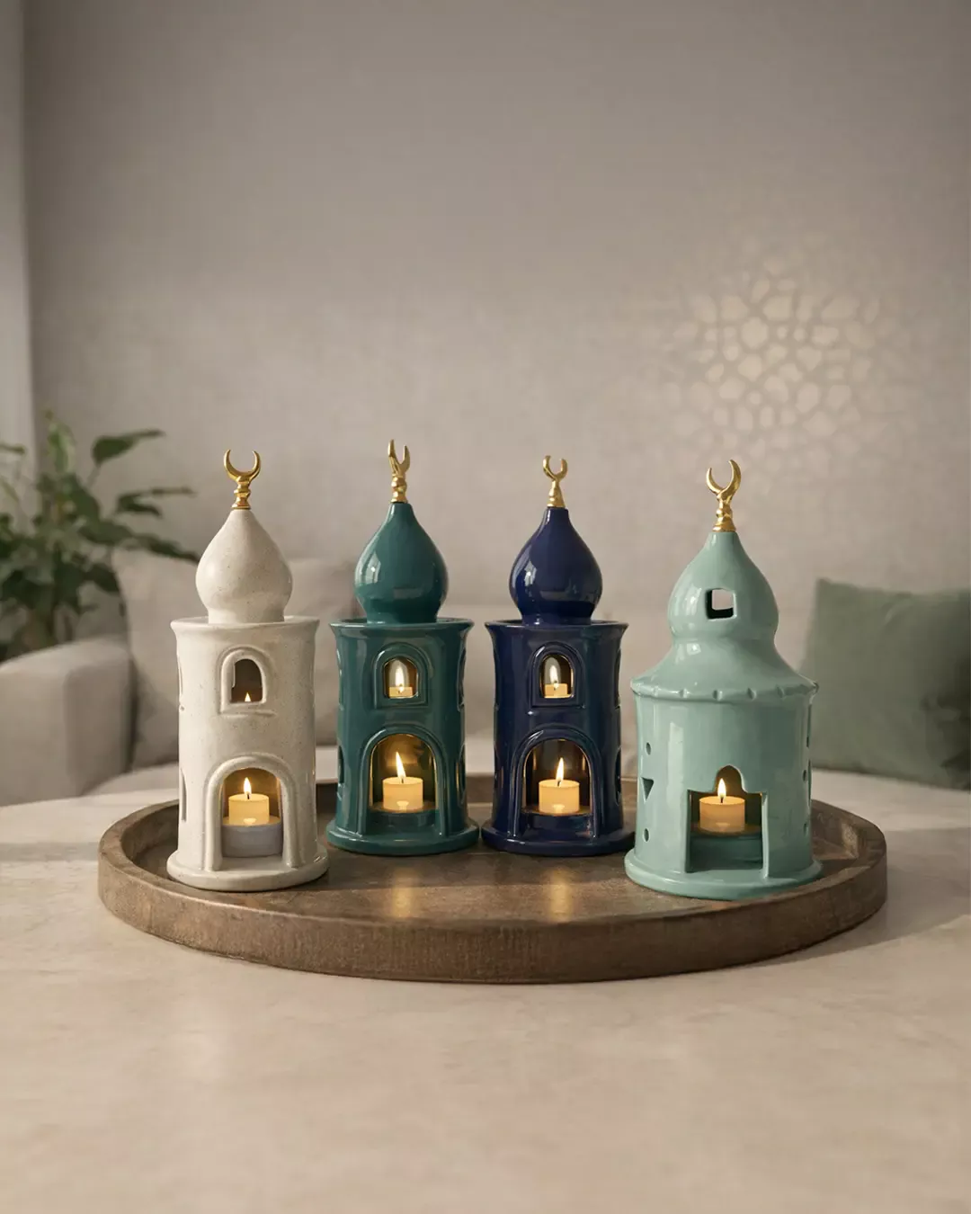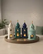 Available in multiple refined colors including Deep Blue, Emerald Green, Ivory, and Soft Mint, each piece can be styled individually or mixed for a curated Ramadan display.